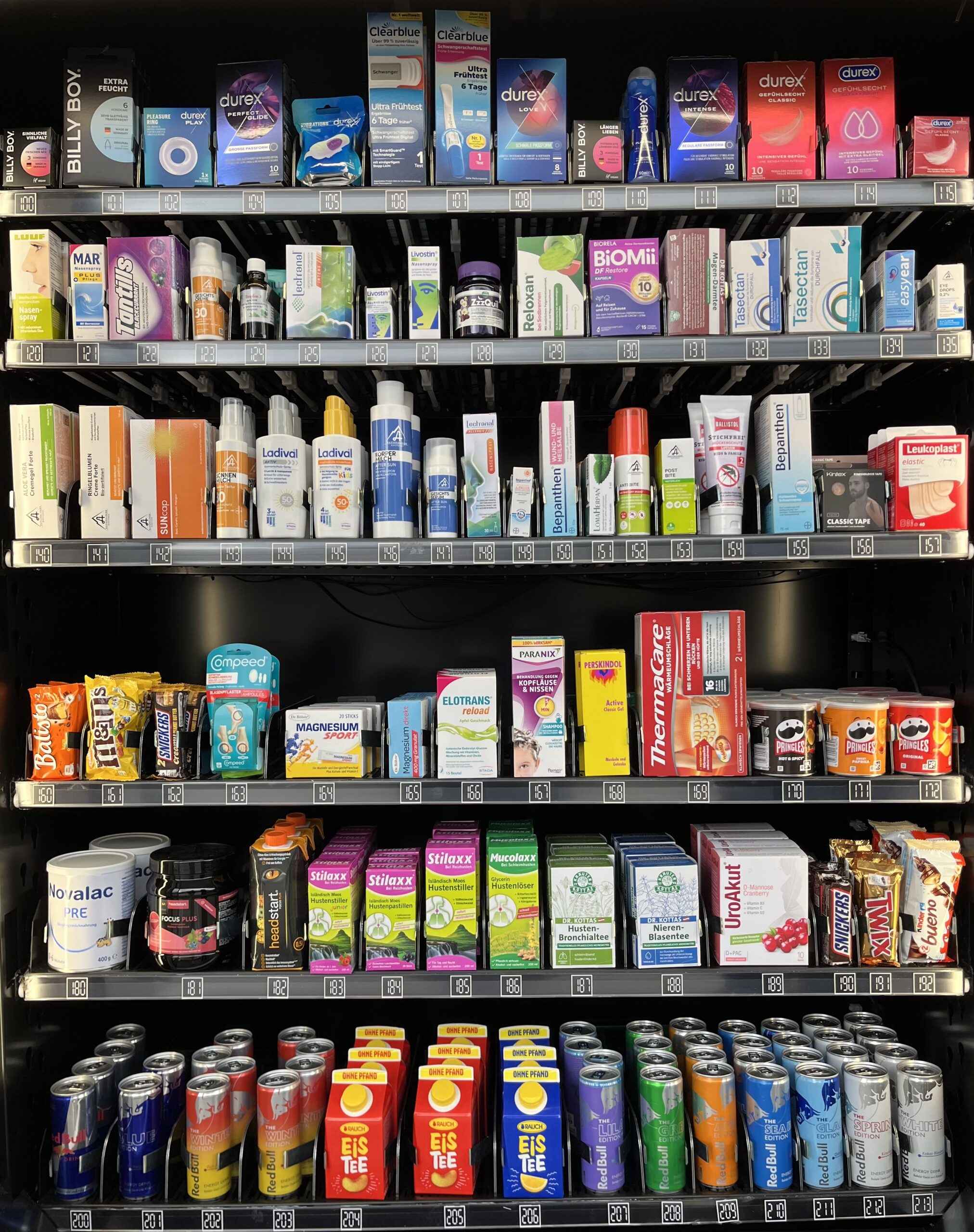 So finden sich neben Mitteln gegen grippalen Infekt, Halsschmerzen, Husten, Schnupfen, Magenschmerzen und ähnlichem, unter anderem auch Kosmetikartikel, Last minute Geschenke, Fiebermesser und saisonale Artikel. Unser Verkaufsautomat bietet nicht nur eine sichere, sondern auch eine sehr diskrete Möglichkeit, Dinge zu besorgen, die manche Leute vielleicht lieber anonym kaufen möchten, wie z.B. Läuseshampoo, Schwangerschaftstests, Kondome und sonstige Artikel für den Intimbereich oder sinnliche Erfahrungen.