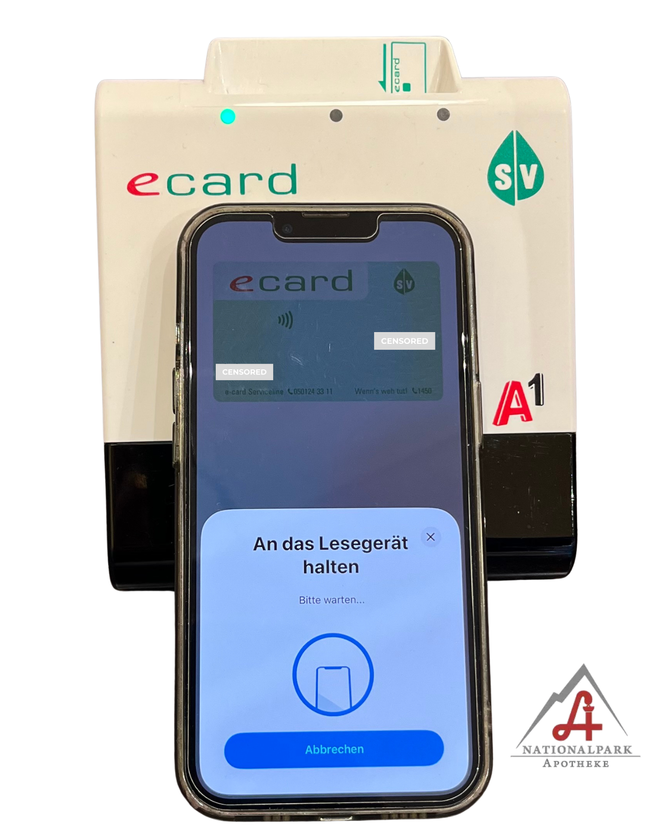 App öffnen → einloggen → digitale e-card aktivieren → beim Lesegerät auflegen