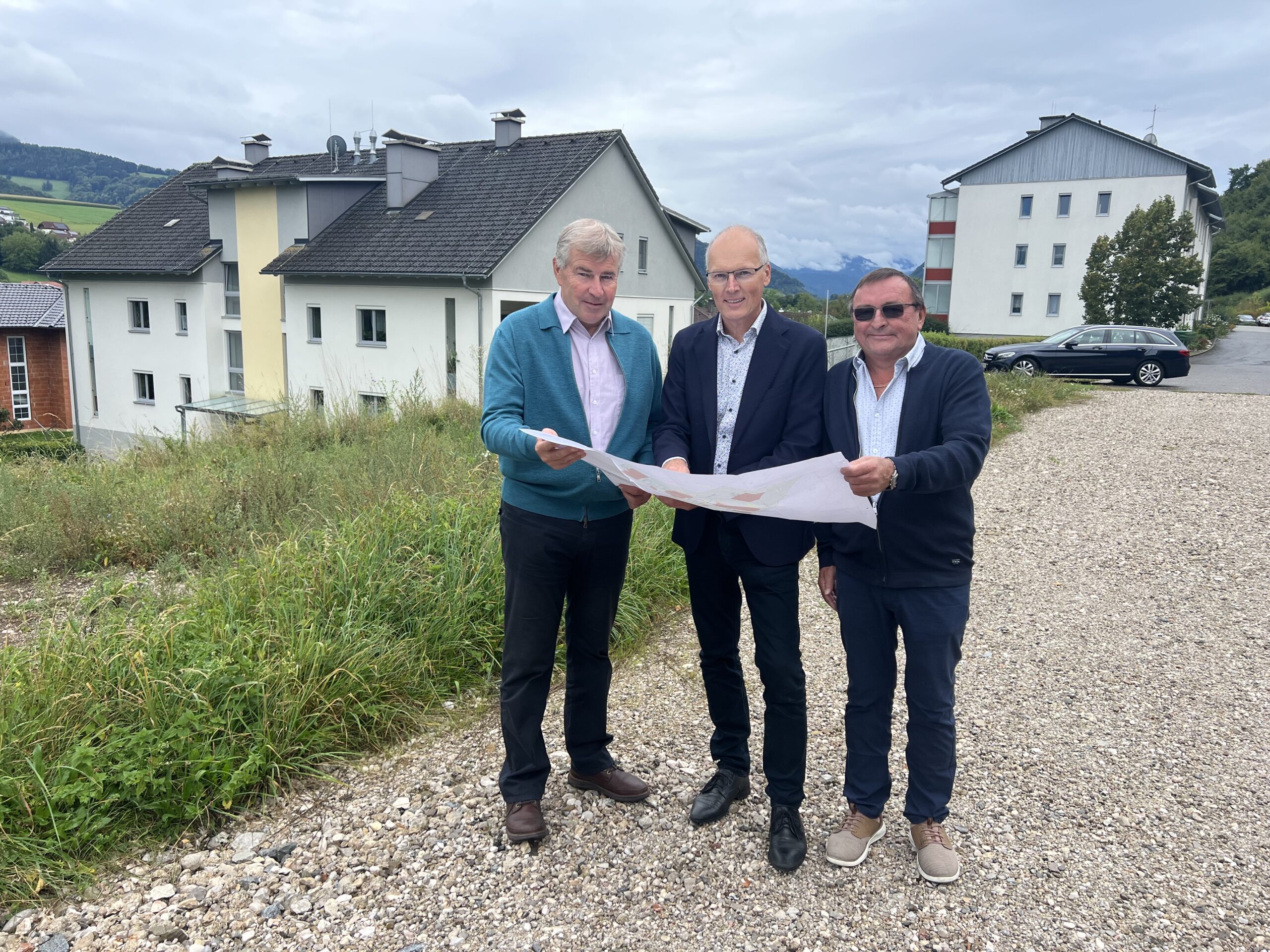 In Kürze beginnen die Bauarbeiten für eine neue Wohnanlage in Grünburg. In ruhiger Lage errichtet die gemeinnützige Wohnungsgenossenschaft Styria in Zentrumsnähe am Hönigfeld in gewohnt hoher Qualität zwölf geförderte Zwei- und Dreiraum-Mietwohnungen mit großzügigen Loggien mit tollem Ausblick. Es ist dies bereits die neunte Styria-Wohnanlage in der Steyrtalgemeinde. „Die Styria ist seit Jahrzehnten ein verlässlicher Partner unserer Gemeinde beim Wohnungsbau. Wir sind eine beliebte Wohngemeinde und freuen uns auf zwölf schöne neue Wohnungen in bester Lage“, sagt Grünburgs Bürgermeister Gerald Augustin (links) – am Foto bei einem Lokalaugenschein mit Styria Geschäftsleiter Prokurist Andreas Eckhart (Mitte) und Wohnungsausschuss Obmann Günter Wandrak. Anmeldungen für die neuen Wohnungen nimmt die Gemeinde bereits gerne entgegen.